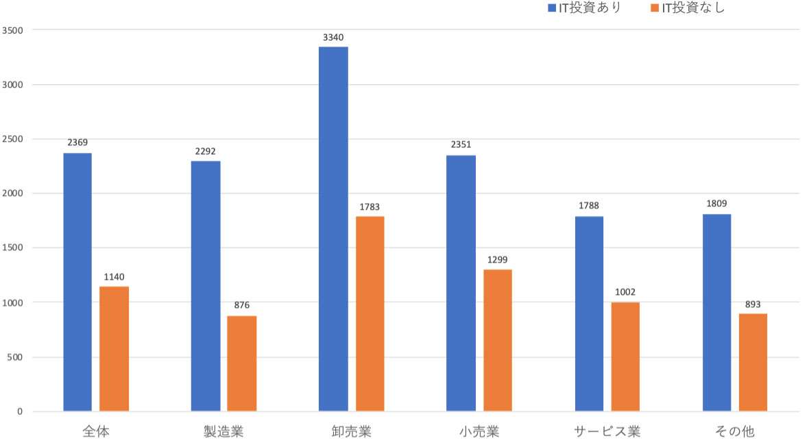 「中小企業白書」に掲載されているアンケートによると、中小企業ではIT投資『あり』『なし』とでは、はっきりと売り上げに差が出ているようです。「中小企業と言っても資金に余裕のある大きな中小企業ほど売り上げが大きいいと言う話だろ!」と言う声が聞こえてきそうですが、まさにそのとおりです。