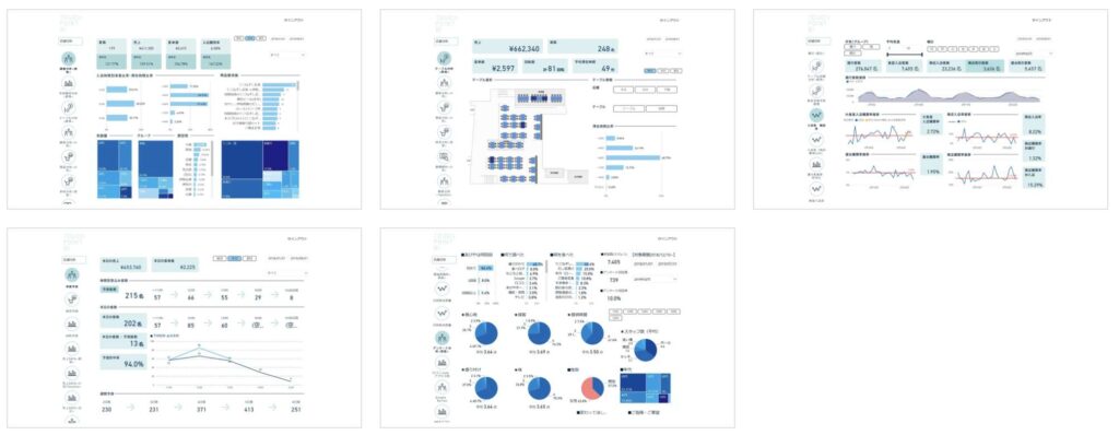 各画面から、連携可能なクラウド・レジの取引情報や、気温や天気などの天候情報、画像解析AIを利用したネットワークカメラの情報、その他ビッグデータなど、店舗運営に関わるデータを自動収集し、可視化している事がよくわかります。