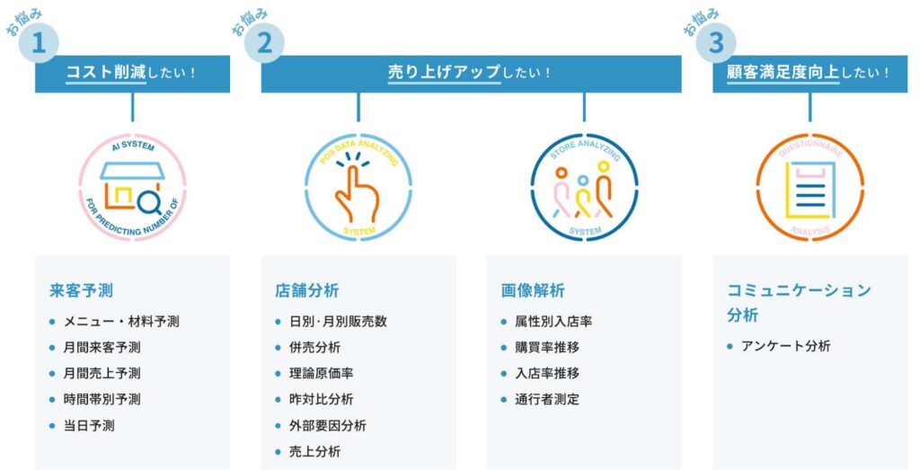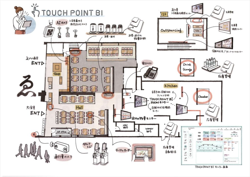 「TOUCH POINT BI」は、過去の売上データ、店舗前の人流、天気予報データ、各テーブルの注文データなどを取り込んで、来客予測、店舗分析、画像解析、コミュニケーション分析などを行って店舗業務の煩わしい作業を全て自動化し、飲食・小売店、あらゆるサービス業を支える経営支援ツールです。