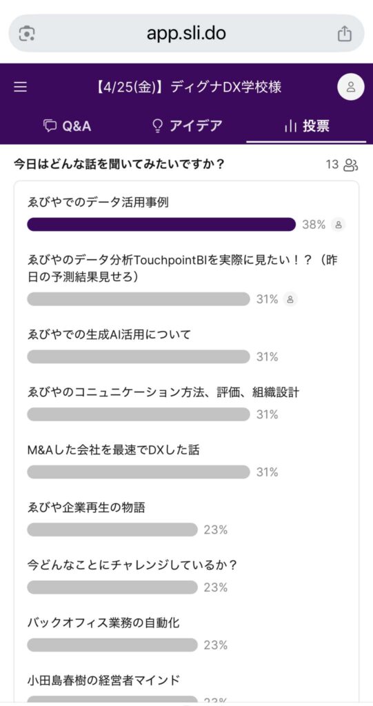 最初に小田島社長がアンケートを取りました。「Slido」というアプリを利用して「今日聞いてみたいこと」をアンケートしたのです。