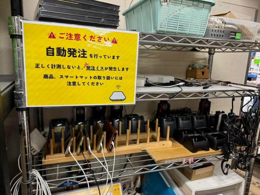 バックヤードでの在庫管理には「スマートマット」というツールを使っていること。調味料や洗剤、釣り銭用の硬貨などをこの上に乗せると搭載されている重量センサーで在庫量を把握し、在庫がしきい値を下回ると自動発注される仕組みであること、この自動発注は発注先の体制に応じてメール発注のほかFAX発注もできること、