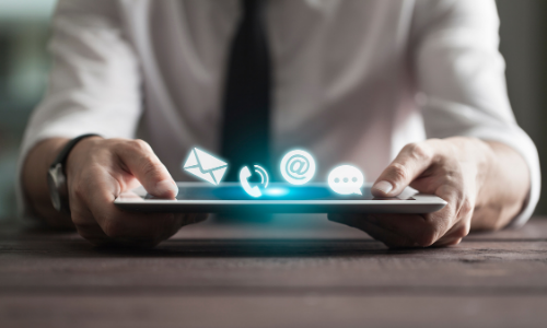 インターネット・プロバイダの提供す「@color.ocn.ne.jp」とか携帯電話会社の「@docomo.ne.jp」とかではなく、自社の名前の入ったメールアドレスを社員全員に取得します。このメールは、パソコンだけではなくて、スマートフォンやタブレットでも受発信できます。社内の連絡に「ビジネスチャット」を導入します。連絡帳に書き込むような、用件だけをズバッと連絡するのに適したツールです。